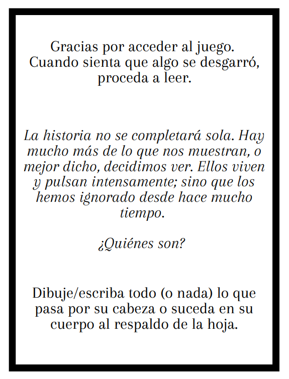 Para el segundo gesto, la investigadora decidió jugar con algunos momentos de extrañación que había identificado, específicamente espiar y un mensaje de texto. La instrucción fue esconderse y no dejarse ver por nadie en la calle, una vez cumplieran el objetivo, tenían que escuchar el audio que se les había mandado. El contenido del audio era un fragmento del cuento “Berenice” de Edgar Allan Poe, que estaba presente en el atlas.